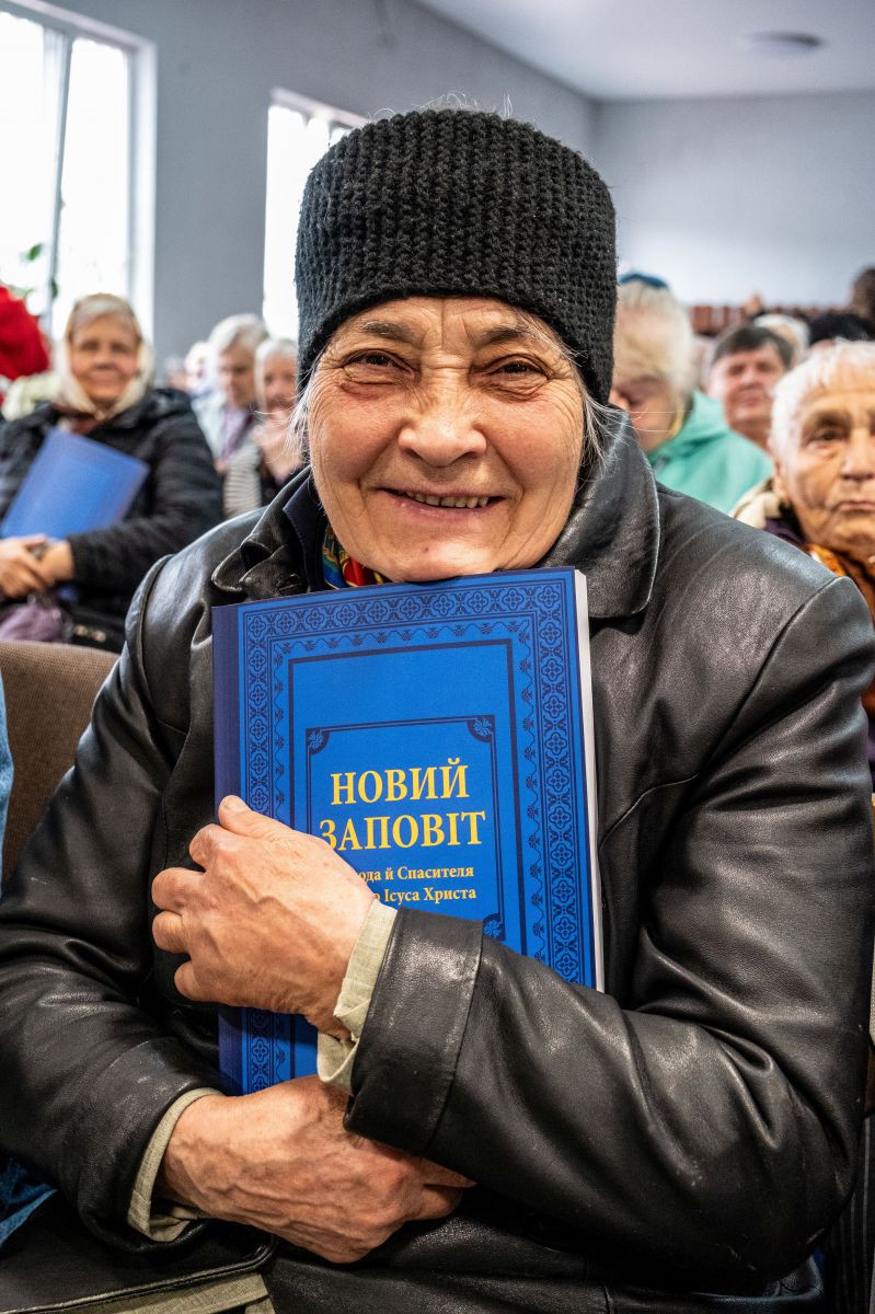Auch die 78-jährige Halyna Antonivna aus Schytomyr hat ein Neues Testament von der Bibelgesellschaft erhalten, in dem sie viel liest. Während des Krieges begann sie aus der Not heraus, eine örtliche Baptistengemeinde zu besuchen, da sie nicht genug Geld zum Leben hatte. Seit die Gemeinde ihr geholfen hat, besucht sie die wöchentlichen Treffen für Menschen in Not. Sie versucht regelmäßig zum Sonntagsgottesdienst zu kommen und betet viel. Ihr größter Traum ist, dass endlich Frieden einkehrt. Halyna Antonivna sagt oft, dass sie sich zutiefst wünscht, immer bei Gott zu sein, denn er ist ihre Sützte und ihr Mut.